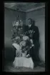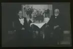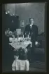 "F.d. kusken Larsson o barn Karl o Ebba." Två män och en kvinna står i ett rum vid ett par bord med gratulations-blommor.