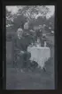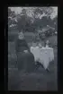 "Axels moster, Sofia Karlsson, Strömkärr 90 år." Porträtt av en kvinna som sitter vid ett bord fullt av gratulations-blommor.