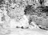 Kvarnfallet 31 i Grevedämmet, hösten 1994. Interiör i fabriksbyggnad. Möjligt förråd. Murvägg med hylla.