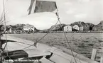 "Svenska Kryssarklubbens fest 1960", troligen i Norrviken på Runmarö. Motorbåtar vid hamnbrygga. I förgrunden två män och en tax med boll i munnen.