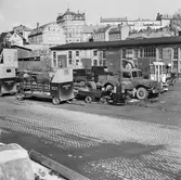 Bilar står parkerade på Häradsgatan i Mölndal, 1970-tal. Fässbergs kyrka tronar i bakgrunden.