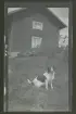 En utklädd man med katt i koppel. "Riksdagsman Gustav Larsson som nergårdslasse foto 1922. "