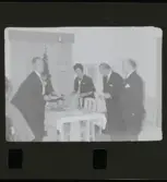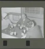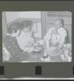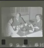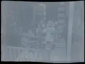 En grupp människor sitter tätt tillsammans i en interiör. En kvinna står bakom dem med armarna lätt utsträckta, och en annan håller en flaska. I bakgrunden syns tapet, gardiner, fönster och en elementradiator