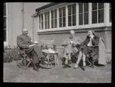 Män och kvinnor spelar krocket framför hus på Lidingö.