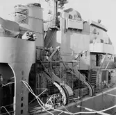 Jagaren Södermanland 1958 På sin jungfrufärd anländer jagaren till Strängnäs. Bild 1: Jagaren har lagt till mot Ångbåtsbron. Hitom jagaren ses slupen Granliden. Den gick i pendeltrafik mellan Ångbåtsbron och Granliden nära Djupvik. Café och badplats för de lite äldre strängnäsborna. Bild 2: Akterskeppet med rännor för minutläggning. Vid återbesök ca tio år senare var vattenståndet så lågt att en av propellrarna gick i botten. Det blev också Södermanlands sista besök i Strängnäs.