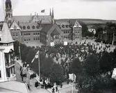 Skara Manskör. Vänortsbesök från Norge 6 juni 1959. Körens ordförande Allan Cederborg hälsar gästerna välkomna till Skara på Läroverkets skolgård.