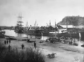 Enligt text skrivet på kopian: "Hamnen väster stenbron, Uddevalla, omkr. 1880".