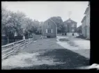 Vy över låg byggnad, Filipstads kyrka i bakgrunden.