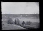 Vy över trädgård, landskap med vatten. Filipstads kyrka i bakgrunden.