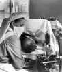 "Stygnen tagas bort" efter magsårsoperation, av syster Marianne assisterad av fröken Gun-Britt Johansson. Från utställningen "Falköping i bild" 1952.