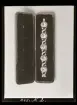 Modell i svart aftonklänning. Svart, flerradigt pärlhalsband."Nordiska Kompaniet, NK:s Franska damskrädderi, original Lanvin. Aftonklänning i svart cloqué". Modellens frisyr så kallad svinrygg.