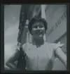 Kvinna med kort, vågig frisyr. Text med blyerts på baksidan: Hygieniska avd. Frisyrer (fru M Oldenburg, Arden)"
