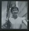 Modell i klänning, brosch, armband och högklackade skor, vid betongglas.