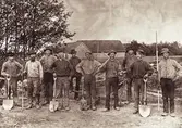 Bilder visar hur vägen på västra sidan av Öresjö byggdes (ibland kallad Fjällvägen) - innan denna vägen byggdes så var här väglöst land. Vägen byggdes under åren 1921-1923. Löjtnant Holmqvist från Hasteröd stod för hela sträckan som entreprenör och lejde ut kilometer till olika arbetslag. Bilden är tagen vid Norra Hagen i bakgrunden kan man skymta Örsbos soldattorp, Arbetslaget på bilden består av Johan Augustsson från Hagarna Djurhult, okänd, Ernst Johansson från Läresbo (Lunnebergsmaden), okänd, Erik Johansson Svenningsdalen Djurhult, mannen i bakgrunden är okänd