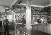 Interiör från en okänd handelsbod i Sundsvall. Butikspersonal och kunder. Vykort.