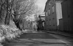 Vinterbild av ett de av s k Tvillinghusen i hörnet av Eskilsgatan-Kungsgatan.