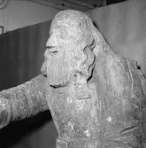 En man i arbete med inmatning av träråvara. Bilden ingår i serie från produktion och interiör på pappersindustrin Papyrus, 1980-tal.