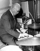 Gruppbild med dragspel och trummor i ordenshuset, Bergby.