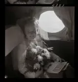 "1680 Bröllop i luften med Abas DC-4 ""Sunnan"" till Paris " En brud sitter i ett flygplan med brudbukett och telegram i famnen.