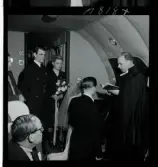 "1680 Bröllop i luften med Abas DC-4 ""Sunnan"" till Paris " Vigsel i luften. Ett brudpar står på knä framför en präst i ett flygplan.