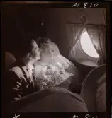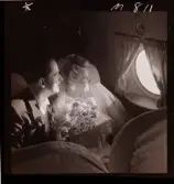 "1680 Bröllop i luften med Abas DC-4 ""Sunnan"" till Paris ". Ett brudpar sitter och tittar ut genom fönstret i ett flygplan.