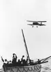 De två båtarna ses på havet för övning, besättningsmedlemmar på däck.