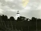 Silhuett av kvinnor och män i motljus vid vattendrag, Östhammar, Uppland