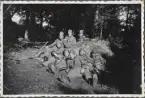"Krigaren vilar sig." Några mannar vilar sig utomhus, mot en rishög m.m.