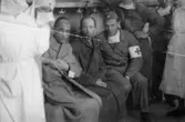 "Karantänsförläggning" på Kvarnbyskolan för flyktingar från koncentrationsläger i Tyskland 1945. Två manliga flyktingar omgivna av Röda Kors personal.