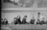 Estländska flyktingar i karantänläger hösten 1944. Familjerna står bakom en taggtråd som omringar det så kallade karantänlägret i Byringe, Örnsköldsvik. I lägren avlusades flyktingarna och de läkarundersöktes grundligt. Deras kläder och tillhörigheter brändes. Vid minsta sårbildning eller spricka i huden fördes flyktingarna till sjukhus. Rädslan för smittsamma sjukdomar var stor under rådande krig. Hösten 1944 flydde 32.000 estländare från kriget i Estland till Sverige. Ett sextiotal personer tog jobb på August Werners textilfabrik i Lindome. Kvinnorna arbetade i spinneriet och männen i färgeriet. Mer information finns i uppsatsen "Estländska textilarbetare i Lindome" som finns i Mölndals stadsmuseums interna arkiv.