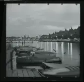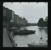 585/40 Facit Nattbild från N.K + Södra Kungstornet. Kvällsbild. Facit-skylt på taket av fastigheten Styrpinnen 22, ritad av arkitekt Ivar Tengbom i hörnet Hamngatan / Kungsträdgårdsgatan i Stockholm.