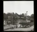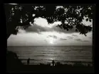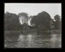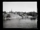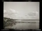 Vy över älv, båt, bebyggelse med Karesuando kyrka i bakgrunden.
