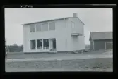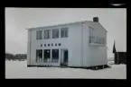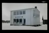 Nybyggd Konsum-butik med en bensinpump av märlket Standard utanför.