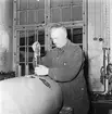 Skrivet på baksidan: Storaverkstaden 13c. Per Månsson sätter zinkanod på nybygget SVERIGEs roder, för att motverka galvanisk frätning på propellern.