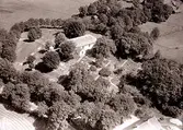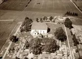 Almby kyrka och sju byggnader. Prästgården. Till vänster syns Tybble gård.