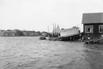 Färjan 264 M/F Scania vid utrustningskajen. Till höger i bakgrunden syns maskinverkstaden.