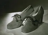 "Mellanskor". Skor i mocka med hög klack och plös.