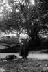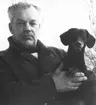 En man (med kamera i handen) och en schäfer i Prästnibble 1920.