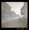 Två män kommer gåendes längs gata. Högar av tegelpannor och bråte på trottoaren.