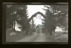 Ett okänt brudpar står framför ett staket till en trädgård med ett hus. En lövad båge med två höga störar med granar i toppen. Bruden i vitt, brudgum med hög hatt.