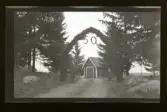 "Robert Pettersson och Arne Lötman, Berg" En man och en pojke står under en lövad portal uppsatt över vägen till en gård. Högst upp i portalens båge hänger siffrorna 50.