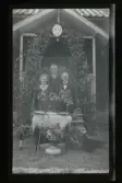 "Rosendal, Hilma och Karl Larsson och Helge." Grupporträtt. Ett par och en ung man poserar framför ett hus. Vid förstubron är en lövad båge uppställd med skylt '60 år', framför dem står ett litet bord med två silverfat och blombuketter.
