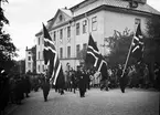"Så gick då tåget, företrätt av tre norska flaggor och beledsagat av Arbetarnas musiksällskaps taktfasta spel, genom gatorna upp till universitetet", utanför Ärkebiskopsgården