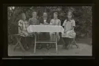 "Personal hos fröken Tamm, Fogelstad." Fem kvinnor runt ett bord dukat med kaffekoppar och kakor.