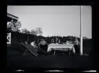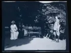 "Familjen Larsson, Lötstugan" En famlij sitter ute vid ett bord i en trädgård.