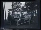 Leonarth Morthensen och sönerna sitter vid ett picknick-bord och fikar, utomhus vid vattnet.