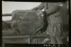 Fotografens mor "Kloar-Inger" på väg upp ur sin källare med ett lerkrus under armen, ett ägg i ena handen och en emaljmugg i andra. Kjorteln är troligen sydd av en säck då den har tryckt text på ena sidan.