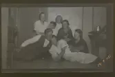 "Vi, Anna, Nils och Elsa Råstedt och Annie" Ett sällskap (fotograf Axel Fredriksson och frun Frida Fredriksson liggandes) porträtterade i ett kök.