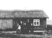 Kvinnor och man framför Lovisa Jansdotters torp på gränsen mellan Litslena by och Hällby gård, Litslena socken, Uppland, 1910-tal