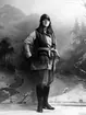 Porträtt av okänd man, bröstbild. Klädd i svart jacka, vit skjorta och svart halsduk. Skägg och mustasch. Kraftigt retuscherat och handkolorerat porträtt. Fotografi i ram Nordiska museet inv.nr 231937.